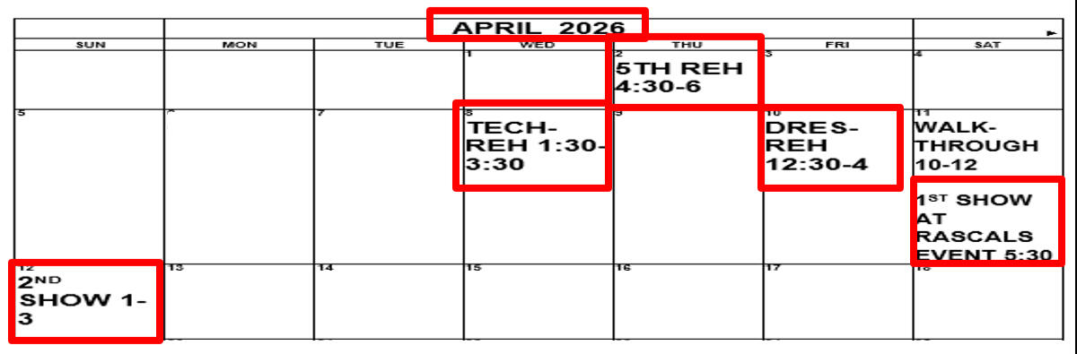 .. SCRIPTS AND REHEARSALS:Scripts given after January 10, 2026Rehearsals begin on March 7, 2026 .